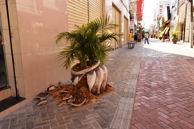 Na madrugada desta sexta-feira (27), mais precisamente às 4h30, conforme registram as imagens, um jovem, acompanhado de outras pessoas, chuta e quebra um dos vasos do calçadão propositalmente.