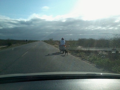 Um flagrante do absurdo: este motociclista arrasta uma cadela pela corda amarrada em sua moto, sem dar a mínima importância para o estado do animal.