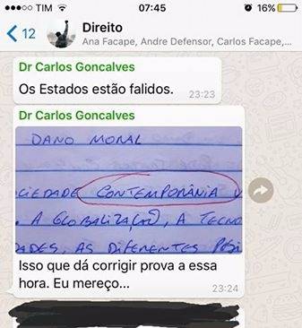 Compreendemos que a liberdade de expressão é uma garantia conferida a todos. Porém, tal direito não deve ser usado de forma inconsequente. Do mesmo modo, a docência deve ser exercida com o objetivo de proporcionar o crescimento acadêmico e a formação da cidadania dos discentes. Em discordância a isso, o Sr. Dr. Carlos Gonçalves prefere instigar por meio da gozação o preconceito e o desrespeito, empregando suas energias para diminuir o esforço e a dedicação despendidos pelos alunos na elaboração de suas avaliações.