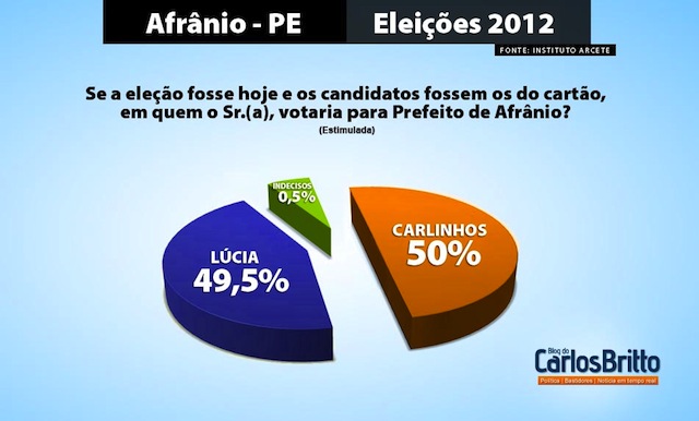 Muito bom ter pesquisa é um ingrediente novo na politica de Afranio, eu apesar de ser suspeito pra falar (sou eleitor de Carlinhos) esperava até um percentual de vantagem maior para carlinhos pelo o que sinto em contatos com as pessoas das diversas localidades do municipio, mas isso não vem ao caso, isso é a realidade, o mais importanto é que o eleitorado de Afranio mudou com a viabilidade politica/administrativa demonstrada por Carlinhos nos ultimos dois anos de seu mandato.