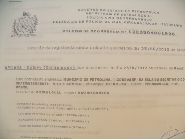 Um boletim de ocorrência (foto) foi registrado hoje (28) na delegacia da Vila Mocó, em Petrolina, no qual acusa o primo de ameaça. “Hoje de manhã o deputado disse em alto e bom som, dentro de uma sala na Codevasf, que a minha pessoa não passava de um moleque safado e que tinha vontade de dar um tapa em minha cara. Não satisfeito, Adalberto disse ainda que me mostraria como se faz depois das eleições,” relatou o prefeito.