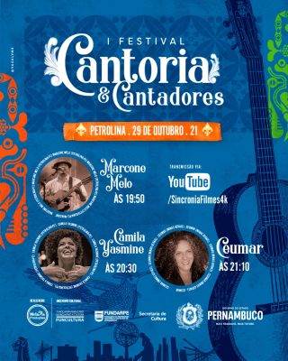 Na sexta-feira (29), a quarta e última noite do 1º Festival de Cantoria e Cantadores de Petrolina começa às 19h50, com a apresentação do cantor, compositor e produtor do Festival, Marcone Melo. Encerrando o grande encontro, duas vozes femininas dão o tom do folclore nordestino e sonoridades contemporâneas: a cantora petrolinense Camila Yasmine e a mineira de Itanhandu, Ceumar, cantora e compositora que vai mostrar referências de violeiros e um repertório próprio.