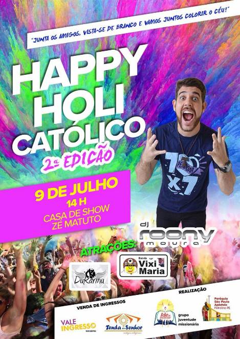 A segunda edição ‘Happy Holi Católico’ acontecerá em Petrolina no próximo domingo (9), a partir das 14h, na Casa de shows Zé Matuto. Realizado pelo Grupo de Jovens da Paróquia São Paulo Apóstolo, no Bairro Areia Branca, zona leste da cidade, o evento terá a renda revertida para a finalização da reforma da Paróquia.