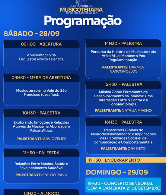 Ao utilizar a música como meio terapêutico, ela promove a expressão emocional, a comunicação e o tratamento de traumas, impactando positivamente tanto a saúde mental quanto a socialização. A programação do encontro pode ser conferida abaixo: