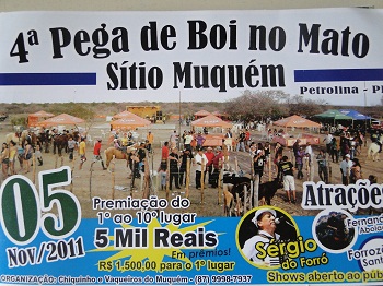 Nós, chiquinho, familiares e vaqueiros do Muquem, agradecemos ao SAMU, Policia Militar, Adagro, Ipa, a todo o público presente, aos vaqueiros e principalmente a todos os nossos patrocinadores pela realização de mais uma pega de boi no mato do sítio Muquem, Festa com a participação de aproximadamente 4 mil pessoas, sem nenhuma briga ou simplesmente pequena discurção, onde agradecemos tambem ao apoio da Policia Militar de Pernambuco.