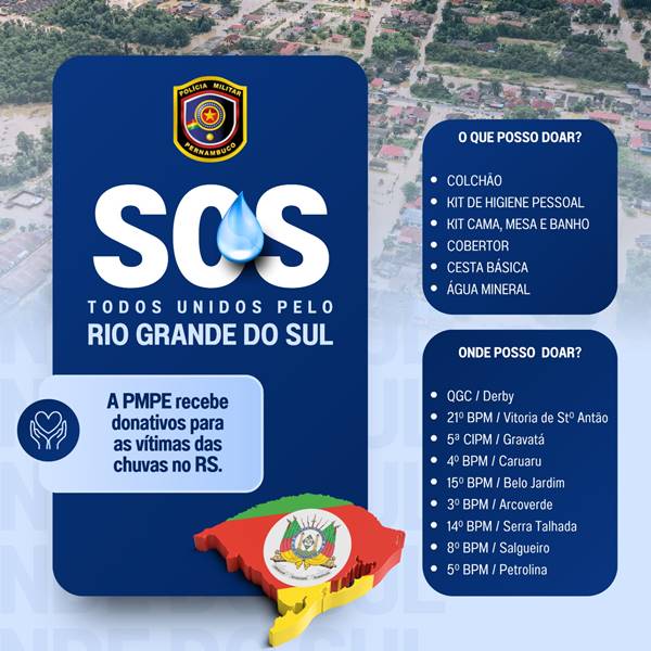 O 5º Batalhão de Polícia Militar (BPM), em Petrolina, é uma das unidades vinculadas à Polícia Militar de Pernambuco (PMPE) engajadas na corrente solidária em prol das milhares de famílias do Rio Grande do Sul atingidas pelas fortes chuvas. A instituição mobilizou uma campanha com vistas a arrecadar doações para a população gaúcha.