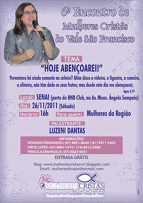 Os conflitos, desafios e perspectivas para família numa sociedade em constante mudança. Estes são alguns dos assuntos que serão apresentados à luz da Bíblia no 6º Encontro do Ministério de Mulheres Cristãs do Vale São Francisco, marcado para este sábado (26) a partir das 16h, no Senai Petrolina. Com o tema “Mas de hoje em diante eu abençoarei a vocês”, a educadora cristã Luzeni Bezerra Dantas trará a mensagem, baseada na bíblia, para as mulheres da região.