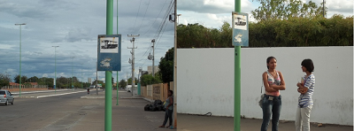 Nas fotos, o leitor critica o fato de não haver a devida identificação das paradas de ônibus, sem contar que também não há abrigos contra sol ou chuva.