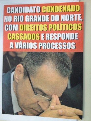Na capa da publicação, que tem formato de revista, está escrito: “Candidato condenado no Rio Grande do Norte, com direitos políticos cassados e responde a vários processos”.