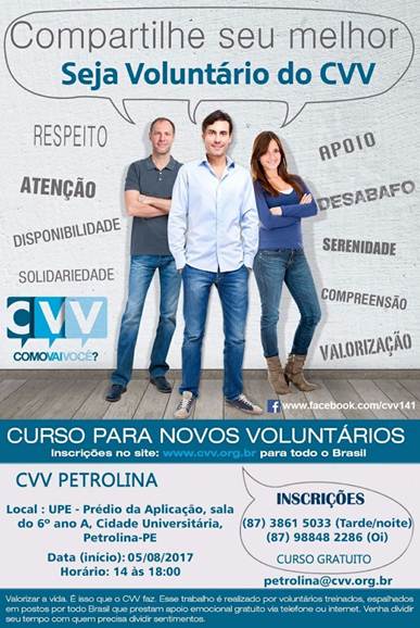 O Centro de Valorização da Vida (CVV) de Petrolina está com inscrições abertas para um curso de novos voluntários. A capacitação é gratuita e será realizada a partir do dia 5 de agosto, às 14h, no prédio do Campus Petrolina da Universidade de Pernambuco (UPE). Para que a pessoa se torne voluntária é necessário ser maior de 18 anos e ter disponibilidade de quatro horas semanais para ficar de plantão na sede do CVV.