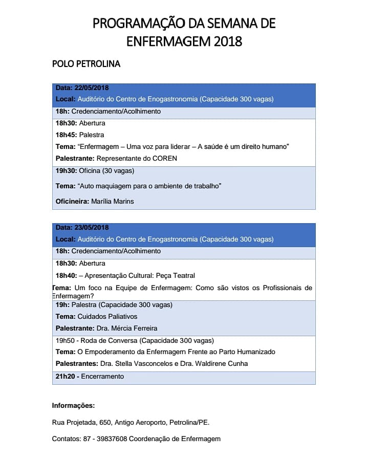 O Senac Petrolina realizará, no dias 22 a 23 de maio, a Semana de Enfermagem, com palestras, oficinas e serviços gratuitos. Para participar é necessário realizar a inscrição no site. As palestras acontecerão no auditório do Centro de Enogastronomia, que tem capacidade para 300 pessoas.
