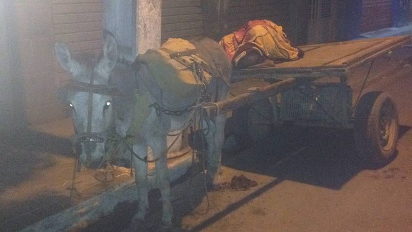 De acordo com informações repassadas ao Blog, via WhatsApp, o jumento da foto passa a noite inteira acordado, de pé, enquanto o irresponsável do seu dono dorme tranquilamente na carroça. Há indícios de que o homem vive bêbado.