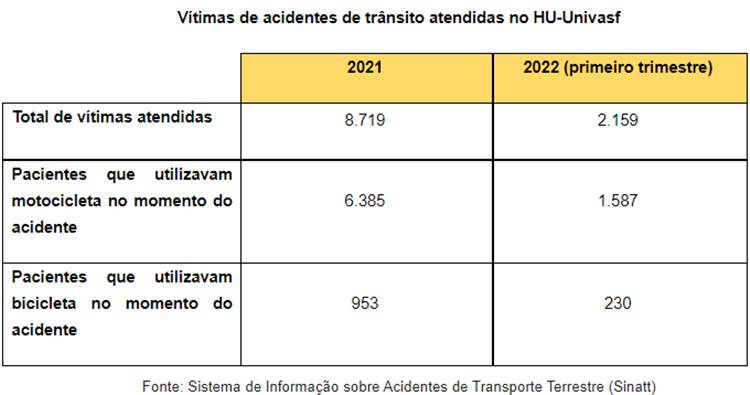 O primeiro semestre de 2022 ainda nem fechou, mas os números referentes ao atendimento realizado pelo Hospital Universitário (HU-Univasf), em Petrolina, a vítimas de acidentes de trânsito já preocupam as autoridades competentes. No ano passado a unidade atendeu 8.719 feridos em ocorrências desse tipo. Já este ano, somente no primeiro trimestre, 2.159 pessoas deram entrada no HU-Univasf, com base nas notificações realizadas pela equipe de Vigilância em Saúde do hospital.