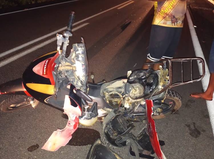 A moto de 50 cilindradas (mais conhecida como ‘cinquentinha) ficou completamente destruída no acidente e o condutor veio a óbito no local. Não há informações sobre o motorista do carro de passeio.