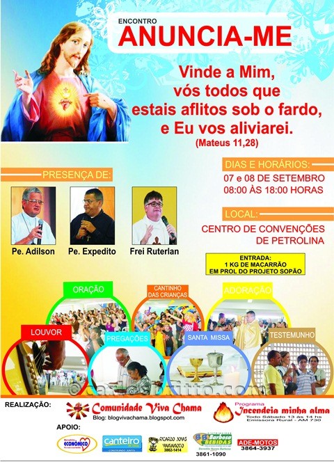 Neste sábado (7) e domingo (8) a Comunidade ‘Viva Chama’ realizará um encontro católico, o ‘Anuncia-me’. O evento será realizado no pátio anexo ao Centro de Convenções Senador Nilo Coelho, a partir das 8h, e se estenderá até o fim da tarde, nos dois dias.
