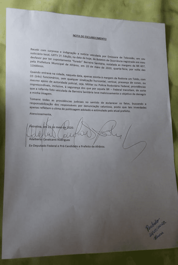 O ex-deputado Adalberto Cavalcanti enviou uma nota de esclarecimento ao Blog, na manhã deste sábado (23), afirmando que recebeu “com surpresa e indignação a notícia veiculada […] em meu desfavor por ter supostamente “furado” uma Barreira Sanitária”.