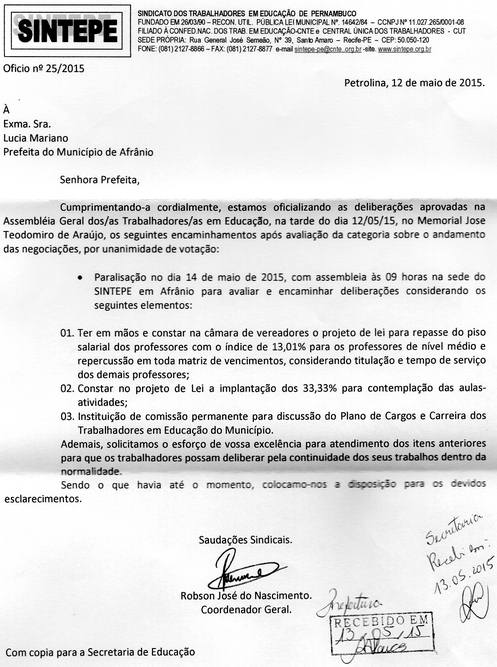 No entanto, o Sintepe alega que já tentou conseguir uma cópia do projeto de reajuste e não foi possível. Outra cópia do documento, informando sobre a paralisação e as reivindicações, foi encaminhada à prefeita Lúcia Mariano (PSB).