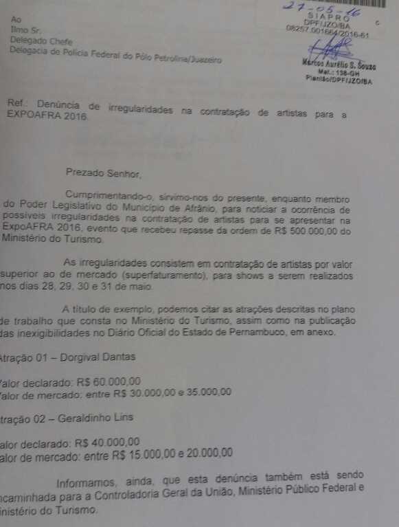 Vavá já protocolou a denúncia junto à Polícia Federal (PF) em Juazeiro (BA), além do Ministério Público Federal (MPF), Controladoria Geral da União (CGU) e Ministério do Turismo, uma vez que os recursos para o evento, no valor de R$ 500 mil, foram oriundos de emenda e chegaram à prefeitura por meio do Ministério do Turismo. Com a palavra, a administração de Afrânio.