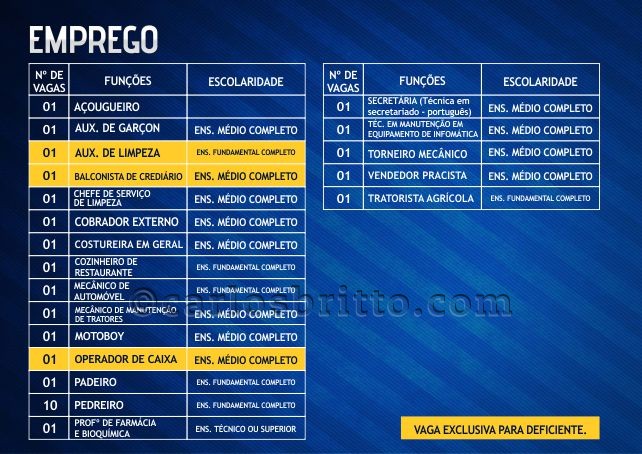 Além das oportunidades para pedreiro, há 19 vagas para outras áreas, três delas direcionadas às pessoas com deficiência. A maioria exige Ensino Médio completo.