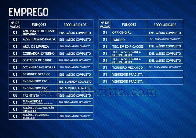 A novidade desta segunda-feira (24) são as oito vagas para frentista, três para cortador de carne, uma para analista de recursos humanos e uma para office-girl. Ainda há chances para quem é engenheiro civil, designer gráfico ou mecânico.