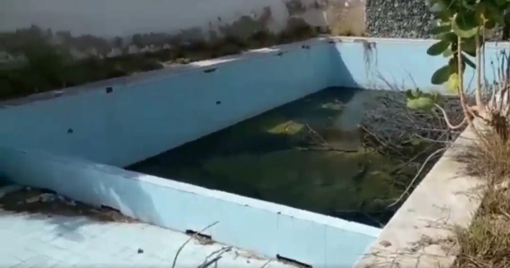 Preocupado com a infraestrutura de uma casa abandonada na Avenida Honorato Viana, no bairro Parque Bandeirante, um comunitário entrou em contato com o Blog e denunciou a quantidade de água parada no local, onde funcionava a piscina da residência.