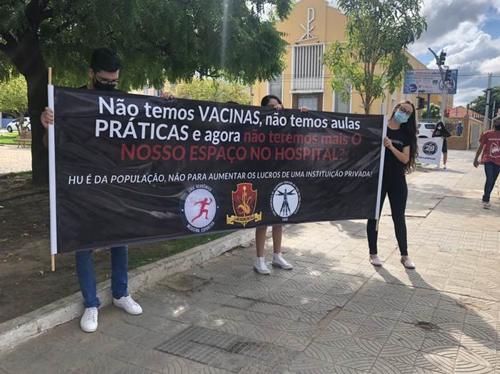 Com vários cartazes, o grupo foi até a Avenida Guararapes, onde fica a sede da Prefeitura de Petrolina. Uma das faixas eles afirmam que o HU “serve à população e não deve atender interesses privados”. Em outra os estudantes indagam: “não temos aulas práticas! não temos vacinas! Agora perderemos nossos espaços de prática no HU-Univasf?”.