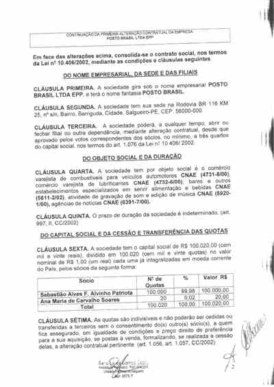O candidato a prefeito pela coligação “Salgueiro Quer Mais”, Alvinho Patriota (PV), enviou ao Blog a íntegra do contrato social do Posto Brasil, onde teria – segundo denúncia da coligação Frente Popular, liderada pelo atual prefeito e candidato à reeleição – uma funcionária ‘laranja’.