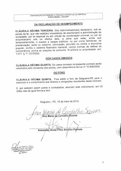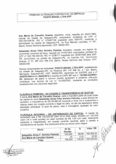 Candidato,todos sabem que o senhor mudou,as vésperas da eleição(veja a data da assinatura:14/05/2012),a participação dos cotistas,prevendo que isso iria acontecer.No outro contrato,de 29/10/ 2003 as coisas eram diferentes,né? portanto,a posto passou 9 anos com dona Ana(sua funcionária) tendo a cota de 99,98 de participação.O que o sr. deixou,foi de dizer isso(o Posto Brasil ltda epp) na declaração de bens do TSE.Por favor,internautas,entrem na página da divulgação de candidaturas da justiça eleitoral: http://www.divulcand2012.tse.jus.br e procurem que NÃO FOI DECLARADO esse bem! POR QUÊ? e cadê o outro contrato de nove anos atrás,antes da mudança?