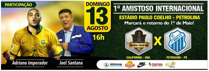 O tradicional 1º de Maio – carinhosamente conhecido por Azulino do Atrás da Banca – retornará às atividades em grande estilo. O time de Petrolina fará um amistoso internacional no próximo dia 13 de agosto, no Estádio Municipal Paulo de Souza Coelho, às 16h, contra o Black Gold Oil, time da Liga Semiprofissional da Califórnia, que pertence à 5ª divisão do futebol dos Estados Unidos.