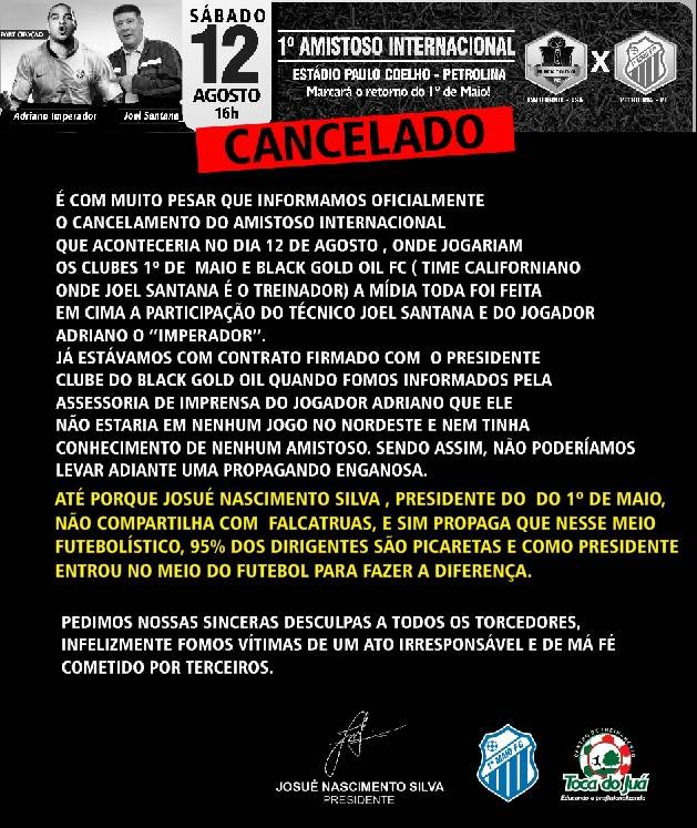 Num comunicado enviado à imprensa, o presidente do 1º de Maio, Josué Nascimento Silva, diz que o contrato já estava firmado com o presidente do Black Gold Oil, “quando fomos informados pela assessoria de imprensa do jogador Adriano que ele não estaria em nenhum jogo no Nordeste e nem tinha conhecimento de nenhum amistoso. Sendo assim, não poderíamos levar adiante uma propaganda enganosa.”