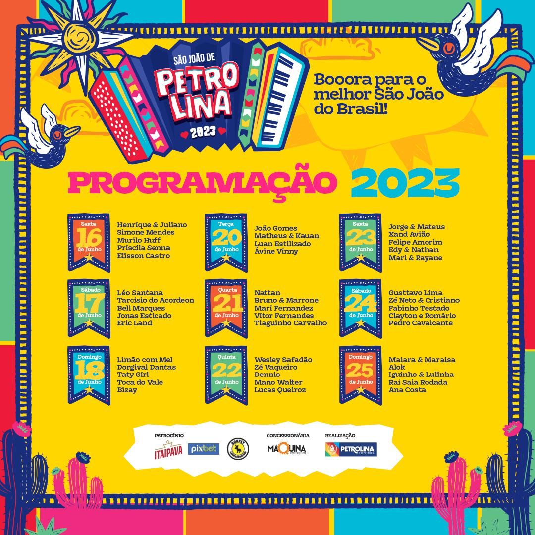 Entre as atrações de renome nacional, o São João de Petrolina terá na programação João Gomes, Léo Santana, Alok, Iguinho e Lulinha, Henrique & Juliano, Jorge & Mateus, Dorgival Dantas, Gustavo Lima, Nattan, Bruno & Marrone e Bell Marques.