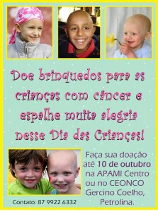Ainda dentro da semana em homenagem às crianças, o Ceonco desenvolve, até terça-feira (10), uma campanha para arrecadar brinquedos. Quem tiver interesse em colaborar, pode fazer sua doação na sede da Apami (na esquina com a 8ª Geres), ou no prédio do Ceonco (bairro Gercino Coelho). Para mais informações, é só entrar em contato pelos números: (87) 3867-9000/ 3862- 8650.