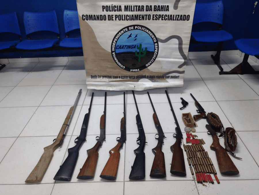 Oito armas de fogo foram apreendidas e uma pessoa conduzida para a delegacia, na sexta-feira (13), no município de Itiúba, norte da Bahia, por guarnições da Companhia Independente de Policiamento Especializado na Caatinga (Cipe-Caatinga).
