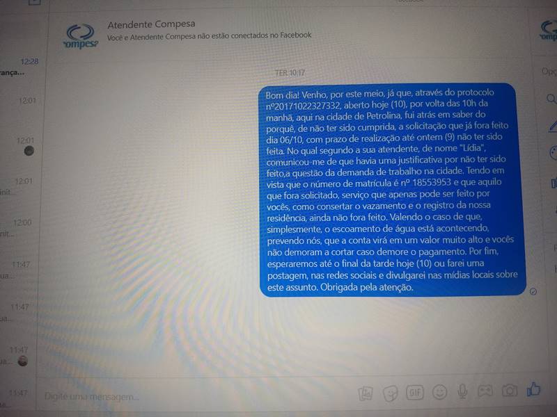 Vale o destaque que isolamos a região, de maneira simples, com o objetivo de não prejudicar mais e torcer para que nada aconteça de sério e mais grave ocorra. A história é esta:  num primeiro momento, entramos em contato dia 06/10, pela manhã cedo. O serviço deveria ter sido feito até dia 09/10, conforme a atendente afirmou à minha mãe que seria realizado. Mas segundo uma outra servidora da Compesa, já no dia 10/10 o serviço fora cancelado com a justificativa de que existia várias outras demandas no município.