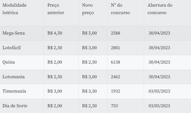 Para a Mega-Sena, a Lotofácil, a Quina e a Lotomania, os novos preços valerão a partir de 30 de abril. Para o Timemania e o Dia de Sorte, o aumento entrará em vigor em 3 de maio. De acordo com a Caixa, o reajuste foi necessário para repor a inflação acumulada desde novembro de 2019, quando ocorreu o último aumento.