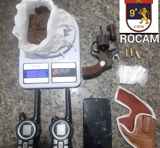 De acordo com o boletim, o indivíduo estava armado com um revólver calibre 32, mais munições, além de aproximadamente 100 gramas de maconha prensada. Também foram apreendidos com ele um aparelho celular, dois rádios comunicadores e sacos para embalagem de entorpecentes.