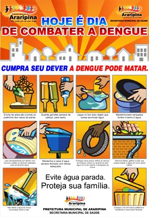 Amanhã (10)  a Prefeitura Municipal de Araripina (PE) fará o dia ‘D’ contra a dengue. A concentração será às 7h, em frente à Secretaria de Saúde, e segue em direção à Praça da Igreja Matriz passando pelas principais ruas do Centro da cidade.
