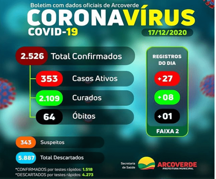 A Secretaria de Saúde de Arcoverde (PE), Sertão do Moxotó, confirmou nesta quinta-feira (17) mais 27 casos do novo coronavírus (Covid-19), além de oito curas clínicas e um óbito. O boletim diário, portanto, fica com 343 casos suspeitos, 5.887 descartados, 2.526 casos positivos, 64 mortos, e 2.109 recuperados.