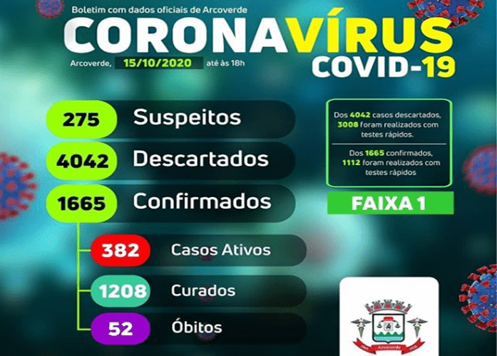 A Secretaria de Saúde de Arcoverde (PE), Sertão do Moxotó, contabilizou nesta quinta-feira (15) mais 16 casos do novo coronavírus (Covid-19) e 8 curados no município. O boletim diário, portanto, fica com 275 casos suspeitos, 4.042 descartados, 1.665 positivos, 52 óbitos e 1.208 recuperados.