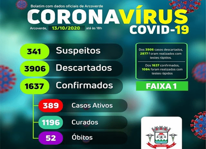 A Secretaria de Saúde de Arcoverde (PE), no Sertão do Moxotó, contabilizou nesta terça-feira (13) mais 12 casos positivos do novo coronavírus (Covid-19) e duas curas clínicas. O boletim diário fica agora com 341 casos suspeitos, 3.906 descartados, 1.637 confirmados, 52 óbitos e 1.196 recuperados.