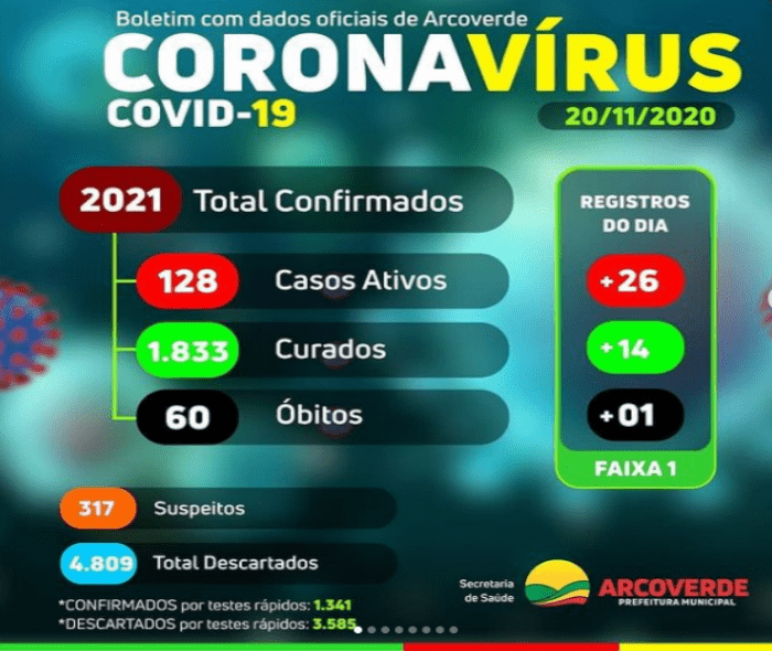 A Secretaria de Saúde de Arcoverde (PE), Sertão do Moxotó, registrou nesta sexta-feira (20) mais 26 casos do novo coronavírus (Covid-19), além de 14 curados e um novo óbito. O boletim diário, portanto, fica com 317 casos suspeitos, 4.809 descartados, 2.021 confirmados, 60 óbitos e 1.833 recuperados.
