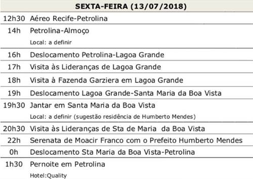 De lá, já à noite, os pré-candidatos seguirão para Santa Maria. A agenda inclui, além de conversas com lideranças da cidade, a presença dos dois na tradicional Serenata da Recordação. No início da madrugada de sábado (14) eles retornarão a Petrolina, onde pernoitarão.