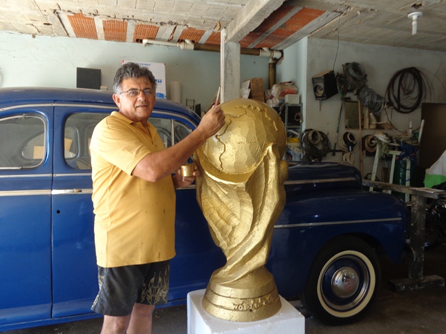 É que no município, o artista plástico e professor, Jaime Concerva, filho do carnavalesco Mestre Jaime está confeccionando uma réplica artesanal da taça. Segundo ele, a ideia surgiu desde setembro do ano passado, quando a taça da Fifa começou sua viagem pública por vários países e capitais do Brasil onde aportou por aqui desde abril.