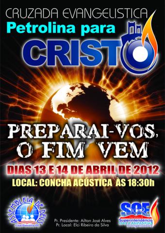 A Igreja Evangélica Assembleia de Deus promoverá nesta sexta-feira (13) e sábado (14), na Concha Acústica, a Cruzada Evangelística “Petrolina para Cristo”. Na programação, que começa às 18h30, haverá muito louvor e pregação com o tema “Preparai-vos, o fim vem”.