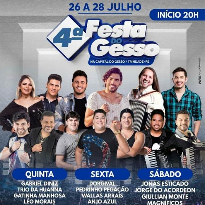 Em resposta às críticas de um grupo de artistas de Trindade (PE), Sertão do Araripe, que chegou a acionar o Ministério Público de Pernambuco (MPPE) alegando que a prefeitura estaria desrespeitando uma lei municipal que garante uma cota mínima de 50% na contratação de artistas locais em eventos festivos da cidade. A polêmica se deu por conta da 4ª Festa do Gesso (foto), que começou ontem (26) e prossegue até este sábado (28). A assessoria da atual gestão esclareceu o fato.