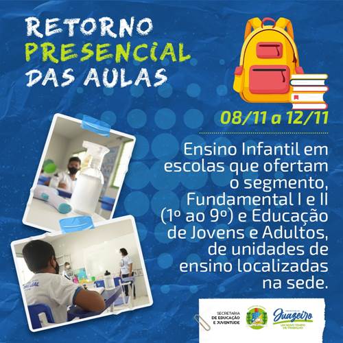 Em Juazeiro (BA), a prefeitura municipal iniciará mais uma etapa do plano para retorno gradual das aulas presenciais da Rede Municipal. Na próxima segunda-feira (8), as escolas receberão os estudantes do Ensino Infantil (nas unidades que ofertam o segmento), Fundamental I e II (1º ao 9º) e Educação de Jovens e Adultos (EJA) – todas localizadas na sede do município.