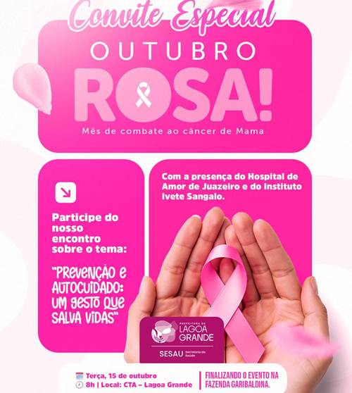 O Setor de Recursos Humanos da Prefeitura de Lagoa Grande (PE), Sertão do São Francisco, com apoio da Secretaria de Saúde (Sesau), realizará na próxima quarta-feira (15) uma programação especial em alusão ao ‘Outubro Rosa’, campanha voltada à prevenção e combate ao câncer de mama. O evento será realizado no Centro de Treinamento e Aprendizagem (CTA) e é direcionado às servidoras municipais. O encontro também integrará a programação do evento ‘Professor em Movimento’, organizado pela Secretaria Municipal de Educação, Cultura, Turismo e Esportes (Seduc), em comemoração ao Dia do Professor. Após a palestra no CTA, que ocorre entre 8h e 9h, as participantes seguirão para a Fazenda Garibaldina, local de largada da corrida especial alusiva à data. A atividade contará […]