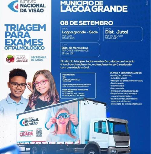 Em Lagoa Grande (PE), Sertão do São Francisco, a Secretaria Municipal de Saúde (Sesau), em parceria com o Instituto Nacional da Visão, vai realizar uma grande ação de triagem oftalmológica gratuita para a população da Sede e dos Distritos. O atendimento acontecerá na próxima segunda-feira (8) em diferentes locais e horários, com o objetivo de ampliar o acesso da comunidade aos cuidados com a saúde da visão. A triagem acontece na sede, nos PSFs 7/10, das 8h às 16h; e nos distritos: Vermelhos, no PSF 04 – das 8h às 16h; e Jutaí no PSF 05, das 9h às 14h. Para participar, é necessário apresentar os seguintes documentos originais: RG, CPF, Comprovante de endereço e dispor de um número de […]