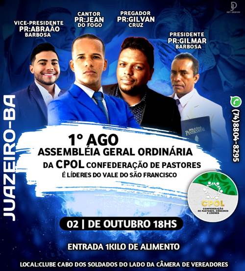 Juazeiro (BA) sediará no próximo dia 2 de outubro a 1ª Assembleia Geral Ordinária (AGO) da Confederação de Pastores e Líderes do Vale do São Francisco (CPOL). O evento beneficente será às 18h no Clube Cabo dos Soldados (ao lado da Câmara de Vereadores). A palavra será ministrada pelo Pastor Gilvan Cruz. Também está confirmada a presenta do cantor e também Pastor Jean do Fogo. A entrada para o evento é um quilo de alimento não perecível. A Confederação tem como presidente e vice, respectivamente, os pastores Gilmar Barbosa e Abraão Barbosa.