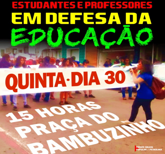 Estudantes, professores e trabalhadores de diversas categorias vão voltar às ruas, nesta quinta-feira (30), em defesa da educação pública e da Previdência Social. Em Petrolina, as manifestações ocorrerão a partir das 15h, na Praça do Bambuzinho, no Centro, e principais avenidas da cidade. A Frente Brasil Popular/Petrolina, composta por entidades sindicais, associações e movimentos sociais, divulgou nota declarando total apoio ao movimento dos estudantes, como parte da luta em defesa dos direitos dos trabalhadores e trabalhadoras do Brasil.
